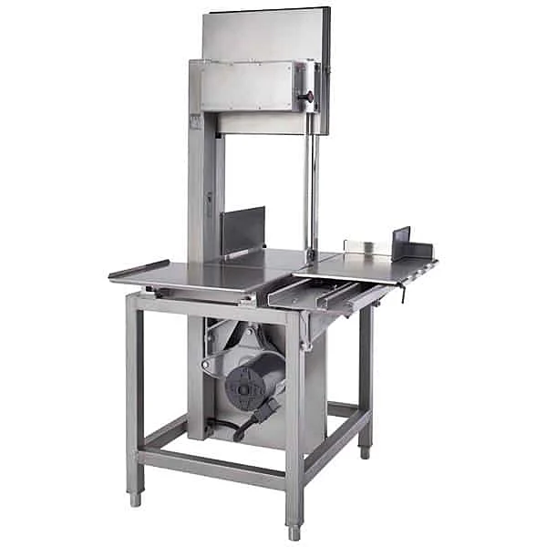 - This heavy duty meat saw features a rugged gauge plate that ensures you have precise regulation of cut thickness, while a center crown pulley design combines with retaining double flanges to provide you with consistent performance over the long haul without the loss of blade integrity.